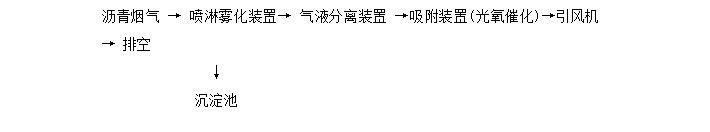 在引風(fēng)機的負(fù)壓作用下帶有粉塵物質(zhì)的瀝青煙氣經(jīng)過加裝噴淋頭的管道,經(jīng)過連續(xù)噴漆淋使煙氣中的油粒子和小粉塵等被沖洗下來、混溶于水中后流入冷卻循環(huán)水池,出來的煙氣經(jīng)油氣分離裝置去除部分油質(zhì)及水分后進入旋風(fēng)除塵除去部分不溶于水的焦粉等粉顆粒類物質(zhì),而后進入瀝青煙電濾器捕集掉剩余的油污及膠粉顆粒,處理后的氣體再經(jīng)過氣液分離裝置再次精細(xì)凈化,然后再進入吸附裝置或光化學(xué)分解裝置,除掉煙氣中的瀝青異味,凈化后煙氣通過煙囪排入大氣。